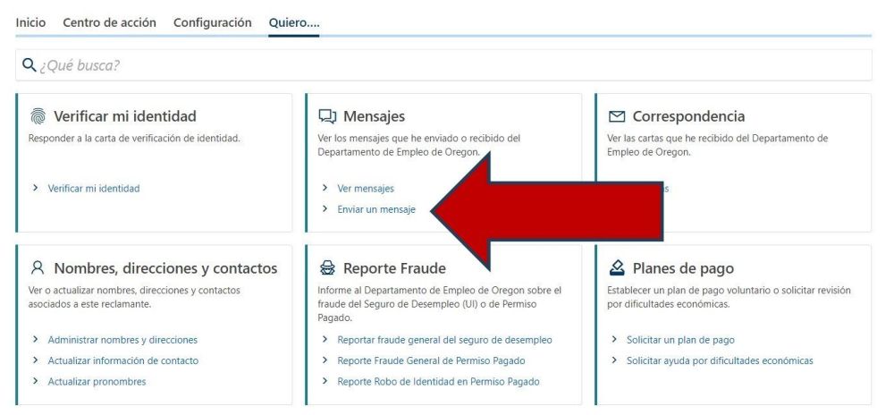 Si cree que ha cometido un error al solicitar beneficios o presentar una solicitud semanal, puede enviarnos un mensaje a través de su cuenta de Frances en Línea. Después de iniciar sesión, seleccione "Quiero..." en la pantalla de inicio. A continuación, busque en el cuadro "Mensajes" y seleccione "Enviar un mensaje".