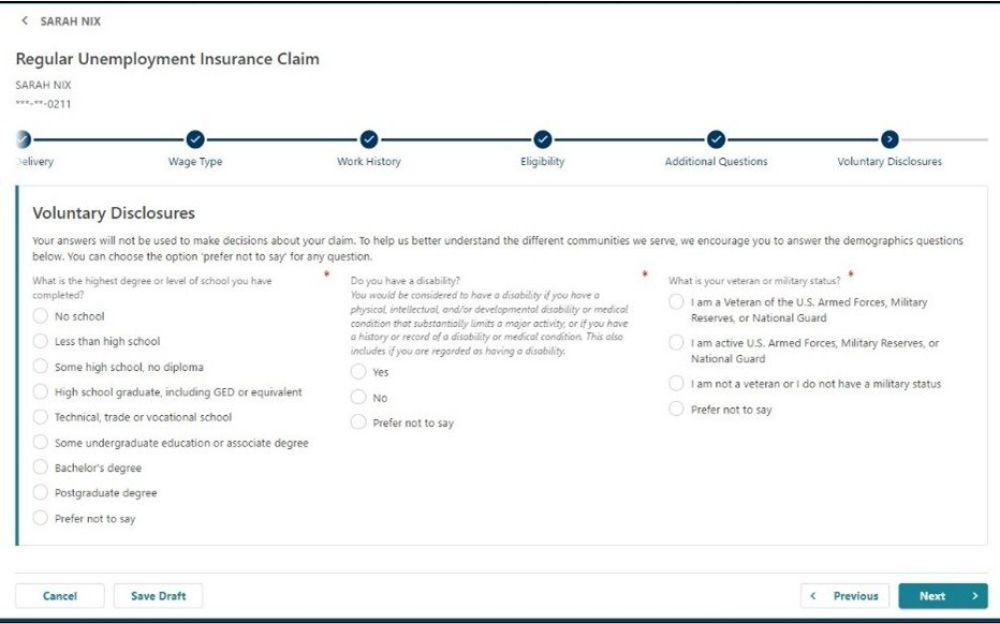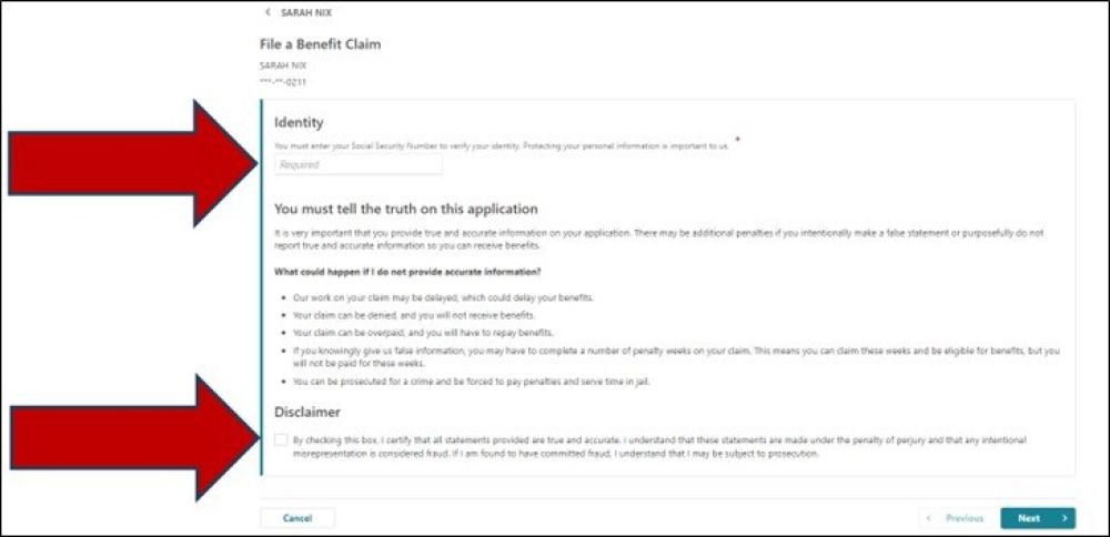 Note: Frances Online is a new system for getting benefits from the Unemployment Insurance Program. We are making regular updates to the system, so the screens you see may look a little different from the images in this guide. You can use the “next” and “previous” buttons to move between screens and update your answers without losing your information. Selecting “cancel” will erase your progress. You can save your progress and finish it later, but you must submit the application by 11:59 p.m. on Saturdays or you will need to start over.